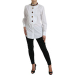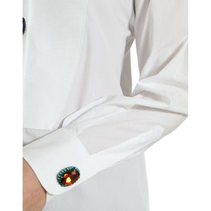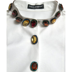 探索这款华丽的 100% 正品 Dolce & Gabbana 长袖上衣的永恒优雅。它采用最优质的白色棉布制成,配有精致的衣领,并饰有众多闪闪发光的多色水晶。正面纽扣开合为这款精美的意大利制造单品增添了经典气息,非常适合希望以魅力提升衣柜的时尚达人。徽标细节巧妙地展示了这个享有盛誉的品牌。
