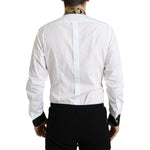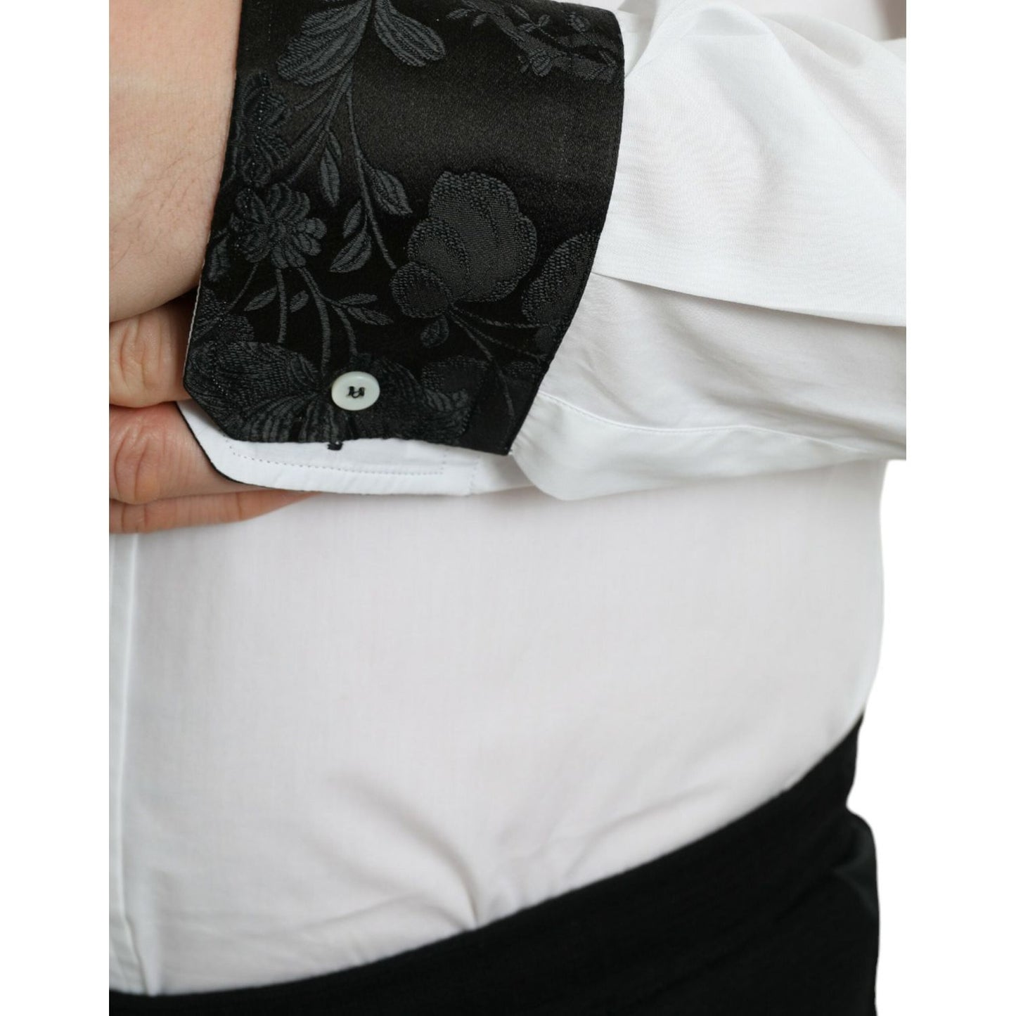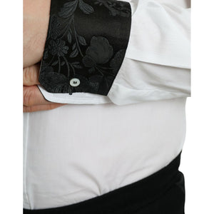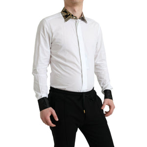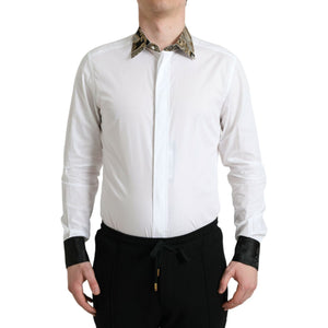 这款精致的白色正装衬衫配有奢华的金色和黑色提花衣领和袖口,让您尽情享受 Dolce & Gabbana 的精湛工艺。这款衬衫采用修身剪裁,由优质混合材料制成,是任何正式场合的真正优雅象征。这款无可挑剔的单品为您的衣柜增添一丝意大利风情。