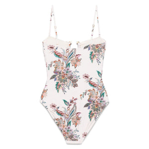 sand beige two adjustable detachable shoulder straps knot detailing paisley print Be mindful to try on swimwear over your own garments. Rhiannon printed swimsuit Size and Fit - This piece fits true to size. We recommend you get your regular size. Model is 1,75m / 5ft 8in wearing size 1 (NUM)